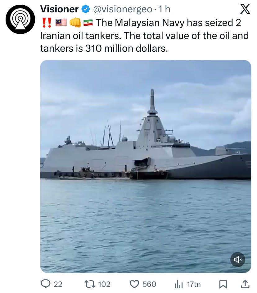 Apparently, Malaysia has stopped two Iranian oil tankers.