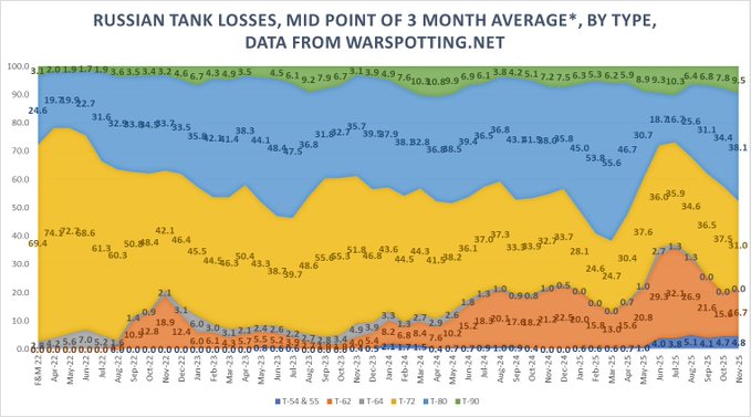 “1) Updates graph of Russia tank losses by Type. T-80s and T-72 continue to oscillate between which is most common, but T-90 and T-54/55 stay remarkably stable at about 10% and 5% respectively.