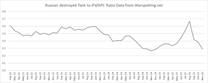 3) The ratio of Russia lost tanks to Russia lost IFVs is at almost record levels. Just 0.3 tanks on average for each IFV/APC Russia losses. interesting that just as recently as July we had a record in other other direction almost 0.7 Tanks for each IFV/APC. we have not seen similar oscillations before, so unclears whey its starting now.