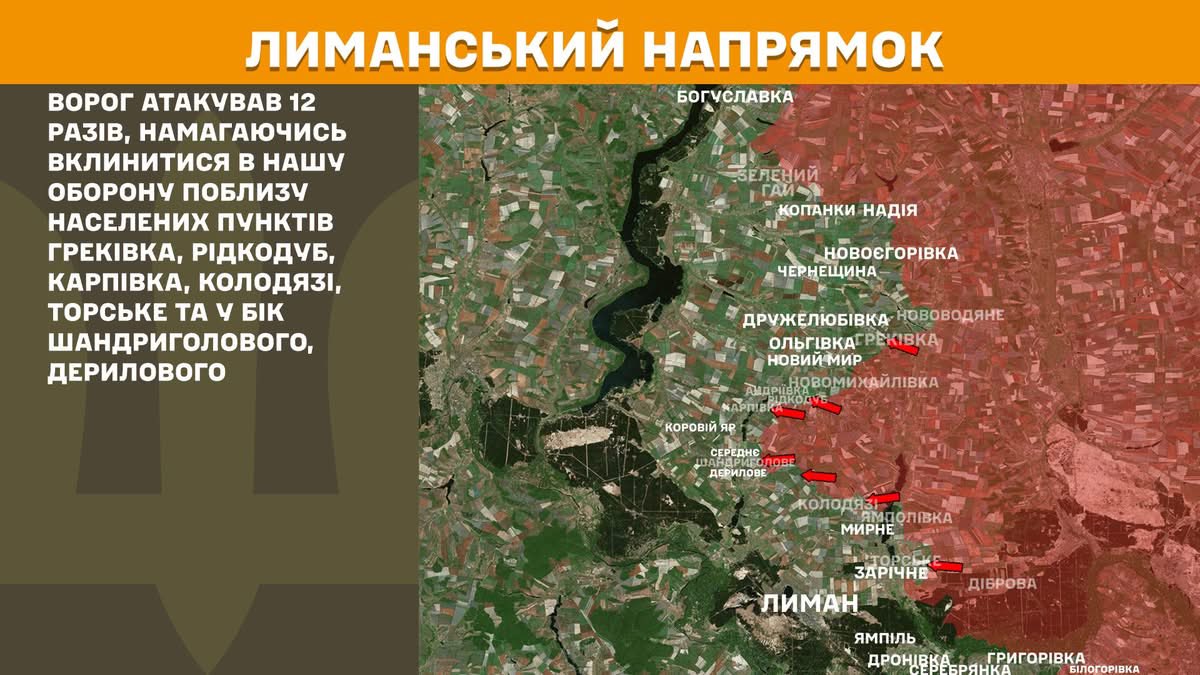 In the Liman direction, the enemy attacked 17 times, trying to advance near the settlements of Karpivka, Hrekivka, Serednie, and in the direction of Drobysheve, Shandryholove, and Derylove.