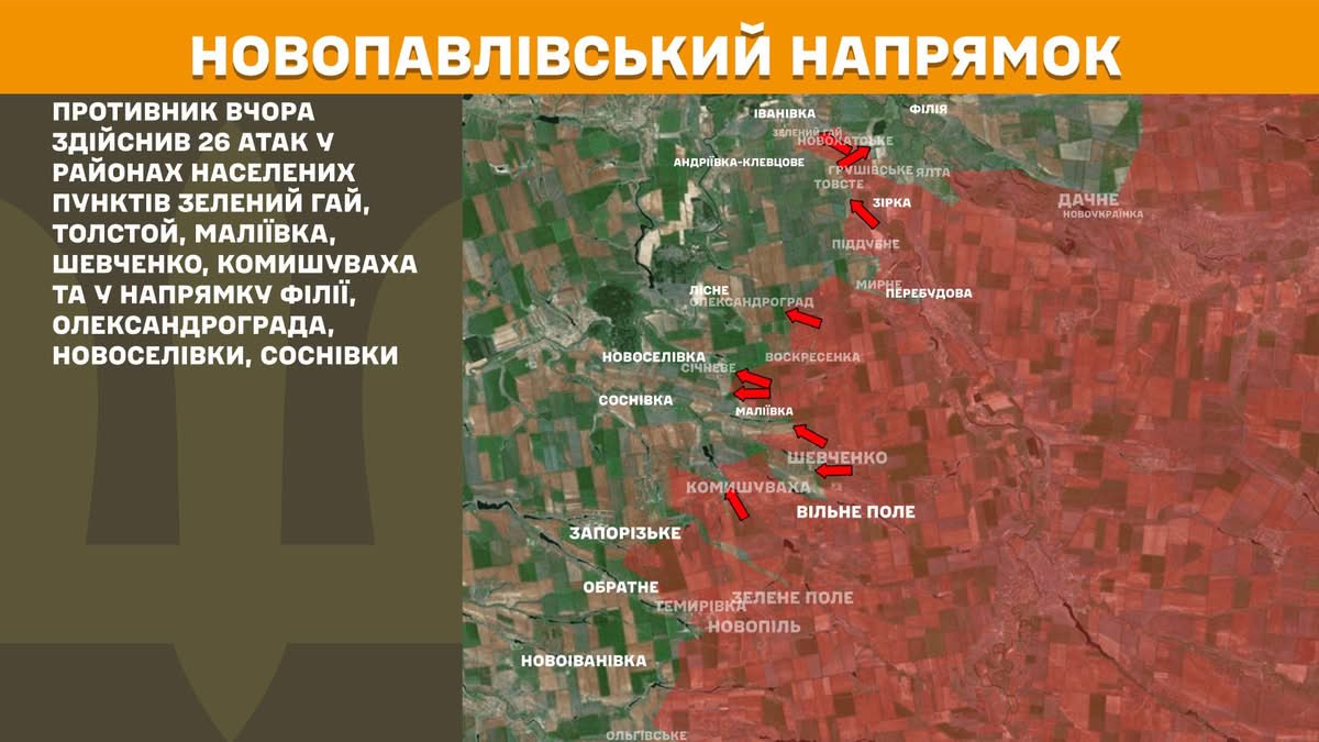 In the Novopavlivka direction, the Defense Forces repelled 22 enemy assaults in the areas of Komyshuvakha, Zelenyi Hai, Obratne, Olgivske, Oleksandrohrad, and in the direction of Ivanivka, Sosnivka, and Filiya.