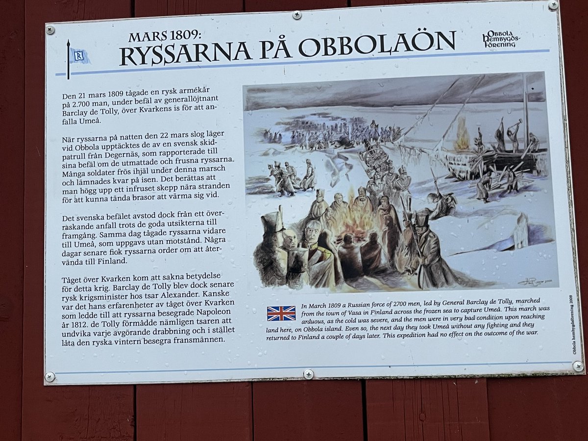 On March 21, 1809, a Russian army of 2,700 men, under the command of Lieutenant General Barclay de Tolly, crossed the ice of the Kvarken to attack Umea. When the Russians set up camp at Obbola on the night of March 22, they were discovered by a Swedish ski patrol from Degernäs, who reported the exhausted and frozen Russians to their commanders. Many soldiers froze to death during this march and were left behind on the ice. It is said that they chopped up a frozen ship near the shore to light fires to warm themselves. However, the Swedish command refrained from a surprise attack despite the good prospects of success. On the same day, the Russians marched on to Umea, which surrendered without resistance.