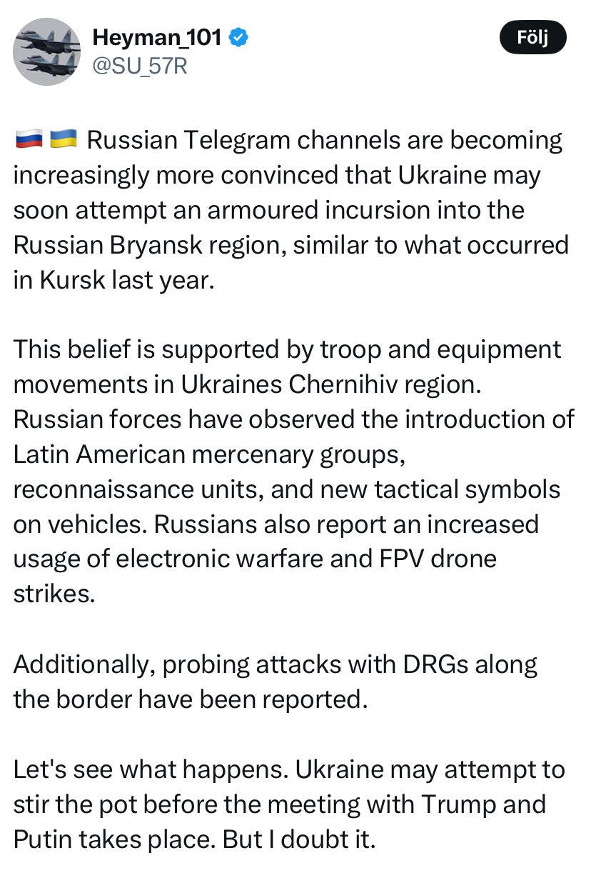 The other thing happening now is that RU attacks near Sumy have essentially ceased. Does anyone seriously believe that Ukraine will attack into Russia now or in the future, Trump has presumably negotiated away that threat?