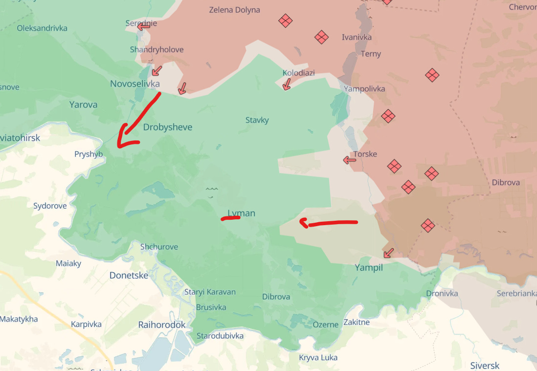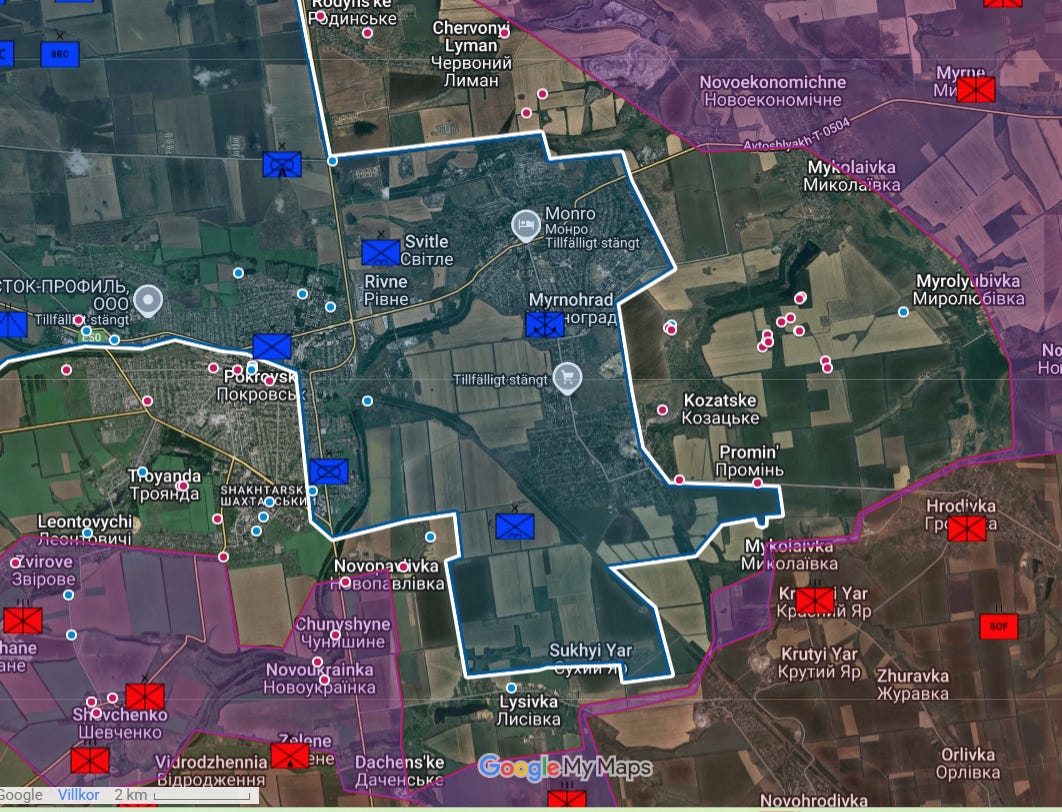 In Pokrovsk, RU is in the center and attacking Myrnohrad. Gregg has been quiet, and he used to always talk about the battalion there that was okay.