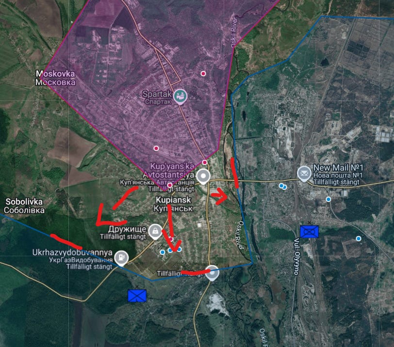 Kupiansk is looking worse and worse, and the bulge east of Oskil is on the verge of falling. The situation in the city is absolutely horrific, and RU is infiltrating their sabotage groups in civilian clothes WITHOUT weapons so UA won’t dare to fight them, and then they pick up arms once inside the city. The defense is 360 defense 24/7 and extremely taxing, if I had to guess.