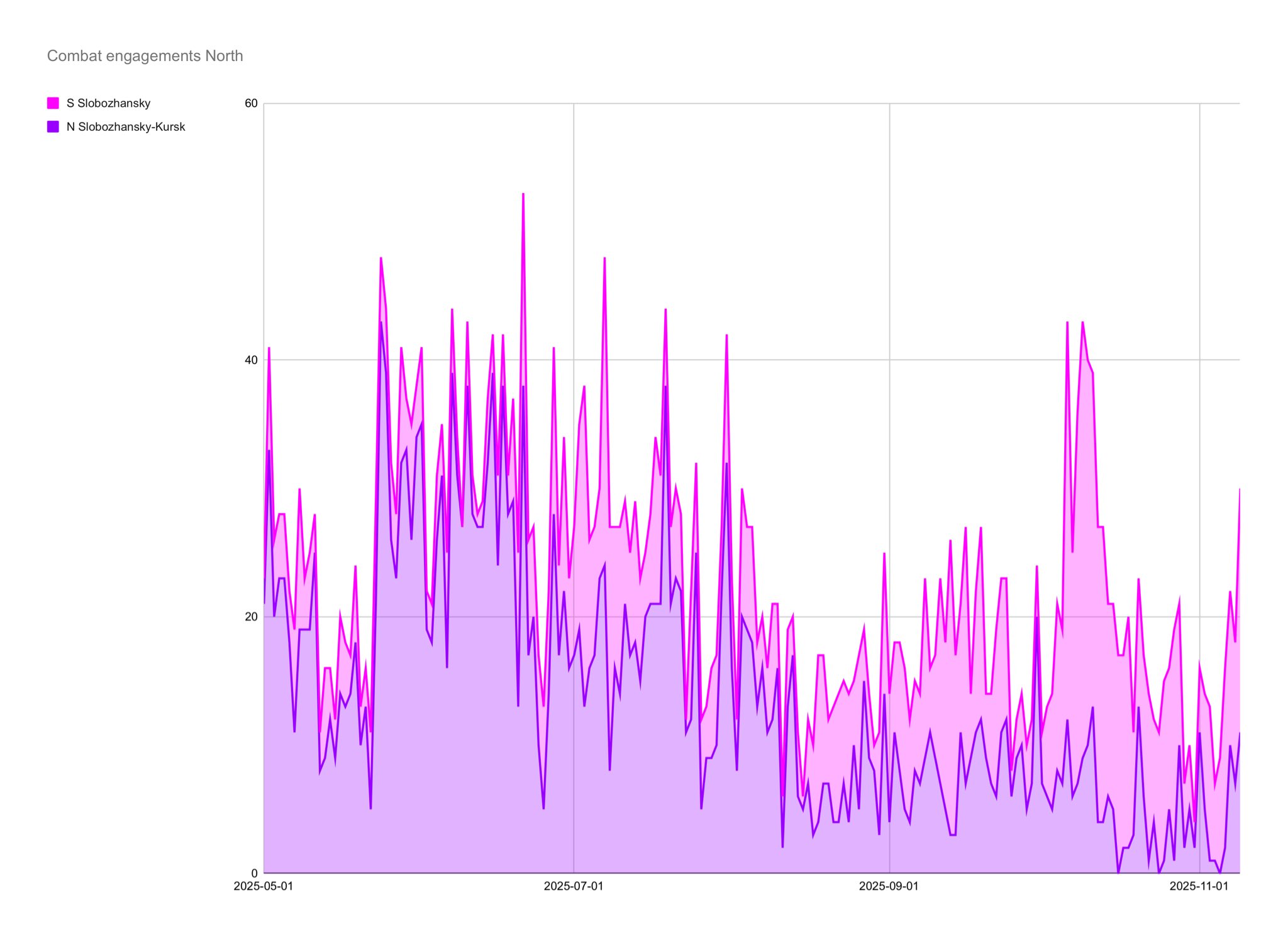 And 28 non-Russian attacks, slightly higher. Kostyantynivka with an unusually low 9 battles may be a candidate. There has been talk of a counteroffensive in Dobrofilia, which I understand belongs to the area.