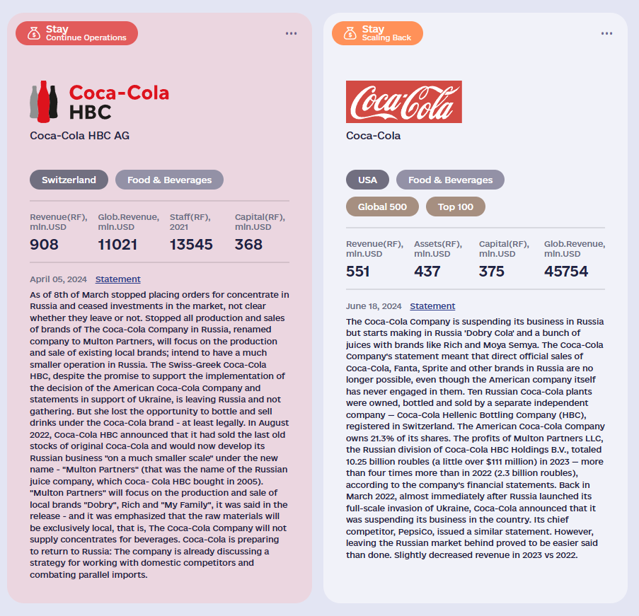 Looks like a Swiss licensee, where Coca-Cola owns about 1/4. Swiss companies and sanctions against Russia and support for Ukraine are not always compatible. What about the American-based company and Russia?