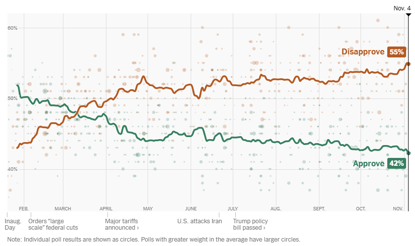 In the NYT’s survey, the dissatisfied have increased by 1%. In the graph, it may seem like the satisfied have decreased slightly, but it’s not enough to have surpassed a whole percent. He is at -13% in total.