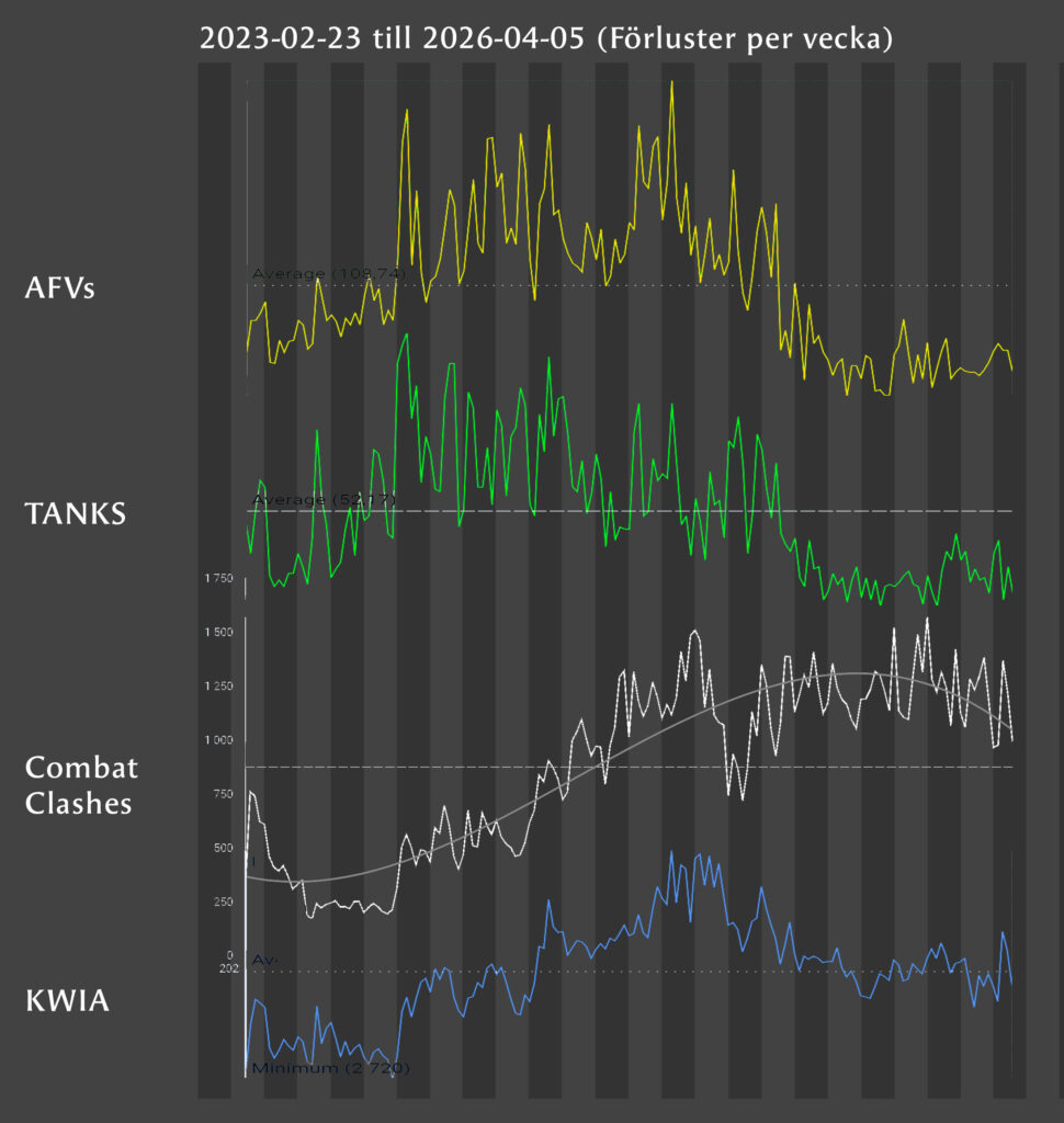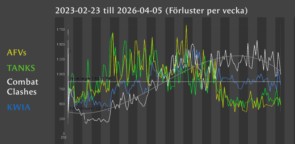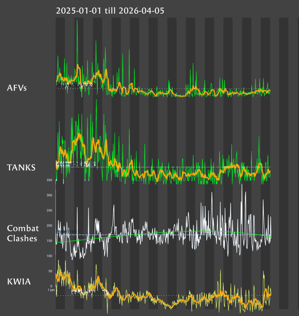 Looking at a longer time perspective, it looks a bit different. Between 2023 and until around the end of 2024, the number of battles and the losses of manpower follow each other and we have a correlation. Tanks and other armor also follow the number of battles but deviate a bit into 2024. While KWIA and battles continue to increase, armor levels off and begins to decrease. Towards the end, we can also see in the image above, that battles increase and are above average while armor is low and KWIA is around average.
