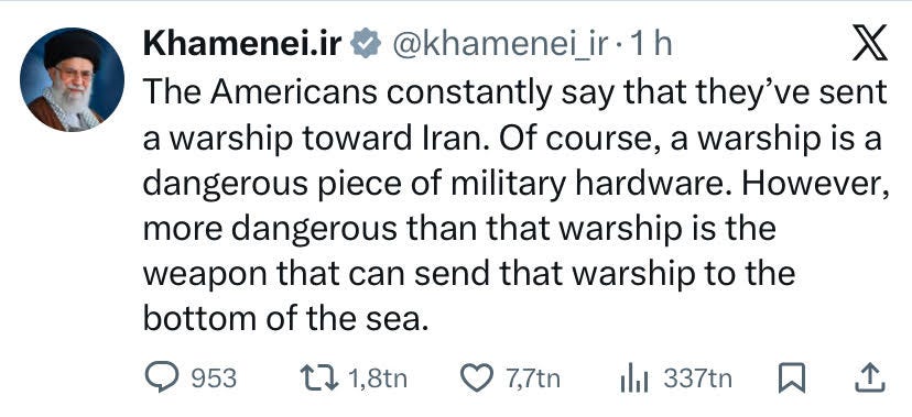 I dagarna har irans ledning häcklat och hånat USA genom alla kanaler dom har vilket man bara gör om man är beredda på en fajt – ”nörd-Trump kan försöka den tjockisen men allt som kommer hända är att alla hans små töntiga båtar kommer sjunka och han får diabetes”.