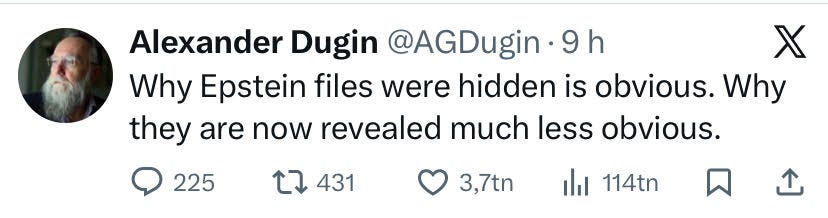 Dugin, vilken fullträff när han resonerar från sin position i Ryssland.