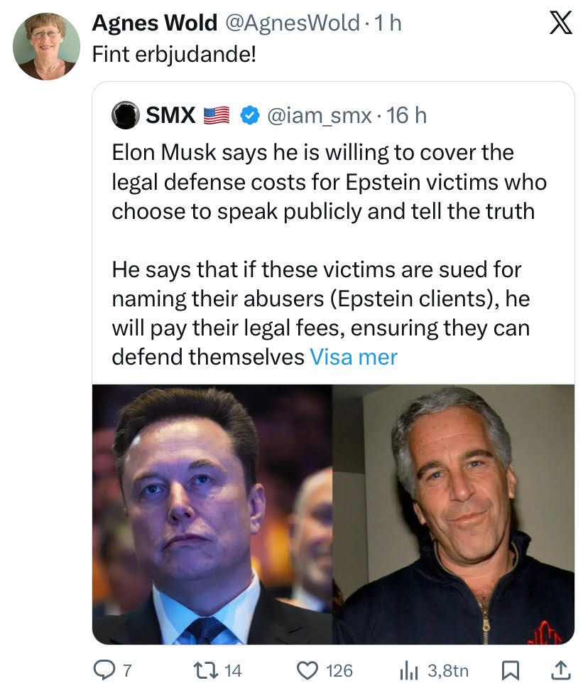 Sen lovar Elon att betala rättegångskostnaderna för alla offer som nämner namn – är det här ett trick kommer han inte till Teslahimlen kan jag lova er men OM det inte är ett reptrick skulle det nog ge oss en flodvåg av utpekade förövare för det är just stämningarna som gjort att offren håller tyst.