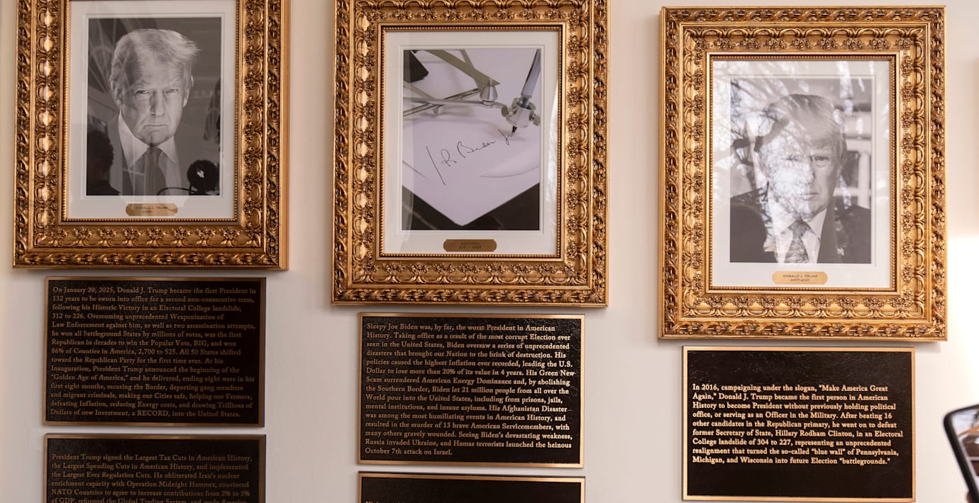 I stället för ett porträtt har Joe Biden fått en bild på en signatur skriven med autopen, en automatiserad underskriftsmaskin – föremålet för en av Trumps vanligaste attacker mot sin företrädare.