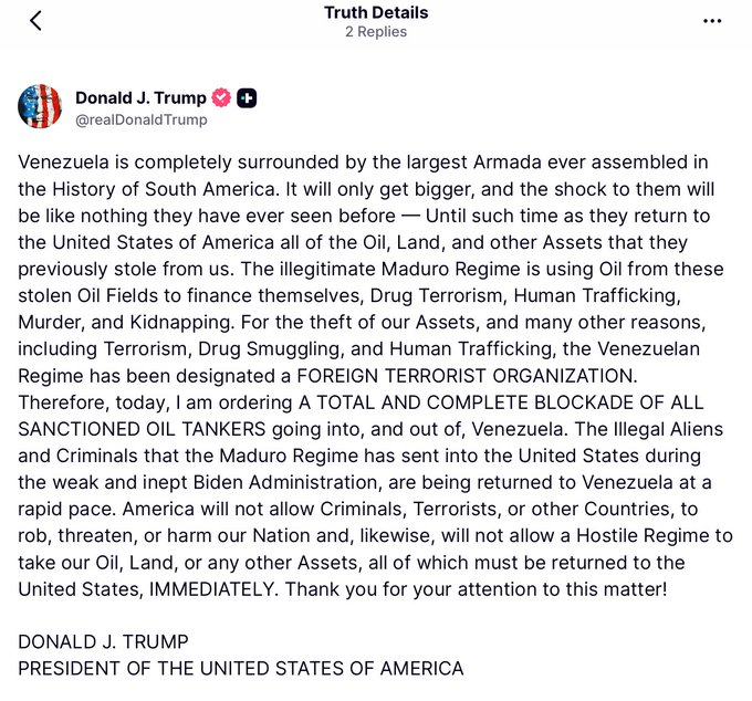 Trump har nu deklarerat att Venezuela är en terroriststat och inför en blockad som ska pågå tills Venezuela lämnat tillbaka all olja och allt land de stulit från USA?!?
