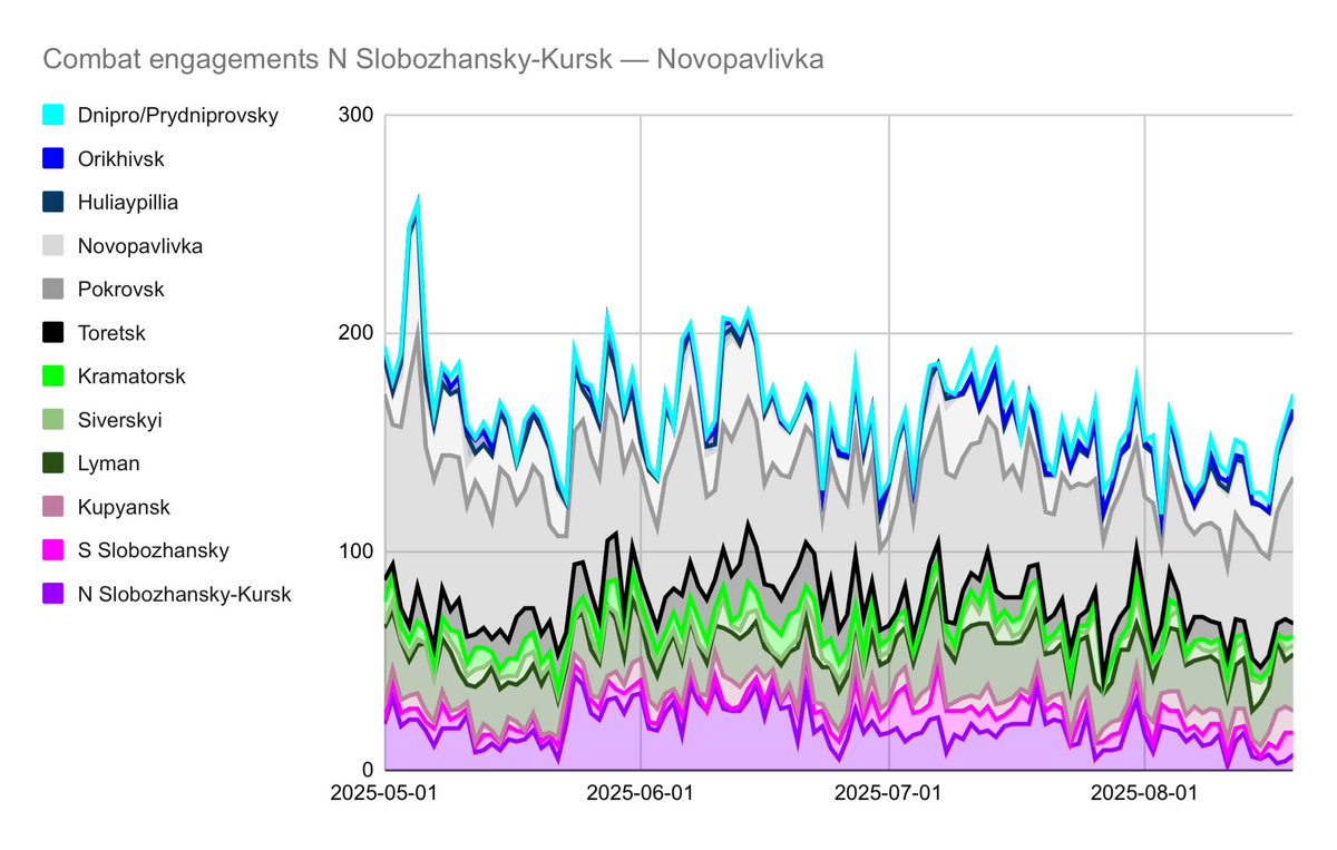 I riktning mot Novopavlivka attackerade fienden våra positioner 29 gånger i områdena kring bosättningarna Zirka, Vilne Pole, Voskresenka, Shevchenko, Novodarivka, Olgivske, Novopil, Zelenе Pole, Maliivka, Shevchenko samt i riktning mot Oleksandrohrad och Komyshuvakha.