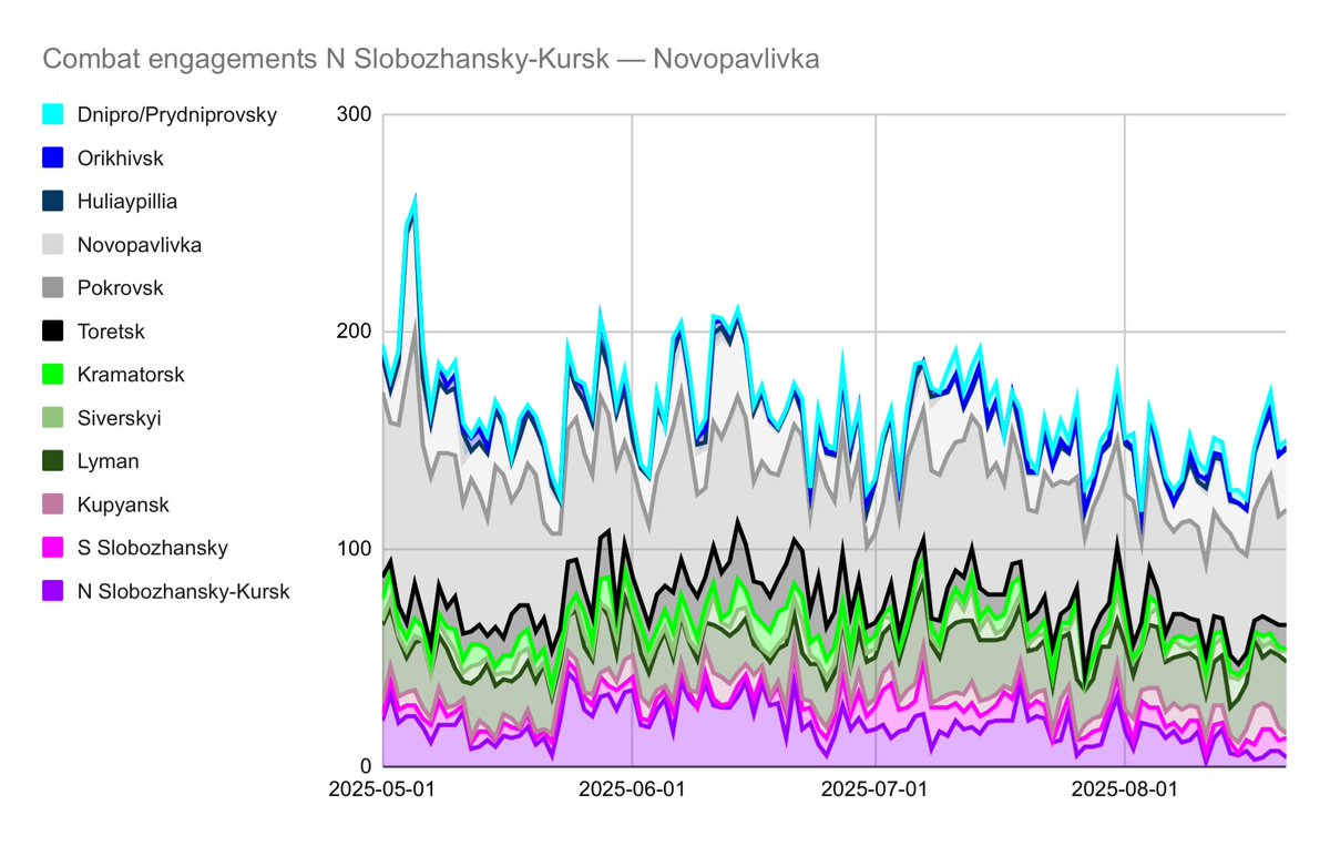 I riktningen Novopavlivka stoppade försvarsstyrkorna 28 fiendeförsök att bryta igenom försvarslinjerna i områdena kring bosättningarna Tolstoy, Shevchenko, Vilne Pole, Voskresenka, Zelenoye Pole samt i riktning mot Filiya, Iskra, Komyshuvakha, Sichnevoe och Novogrigorovka.
