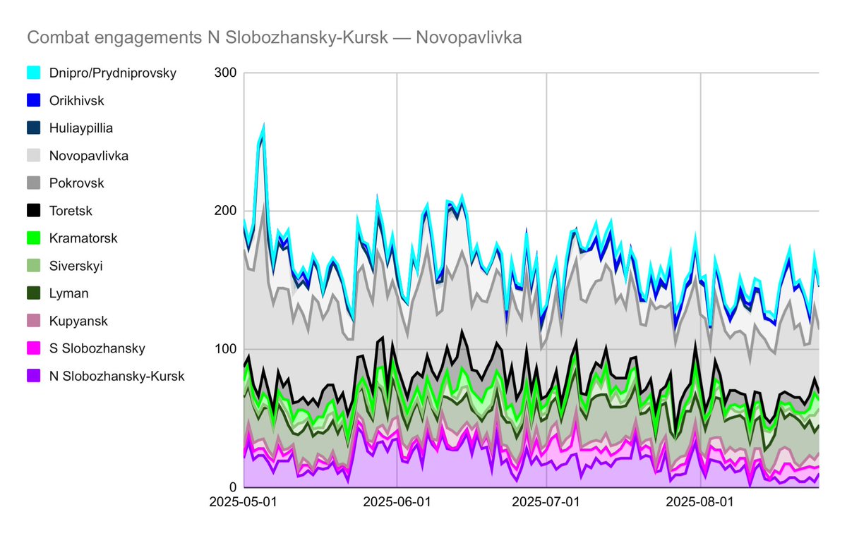 👍 Den långsamma nedåtgående trenden sedan maj ser ut att hålla i sig, verkar främst bero på att det lugnat ner sig vid nordöstra fronten (Slobozhansky-Kursk) men även vid Pokrovsk.