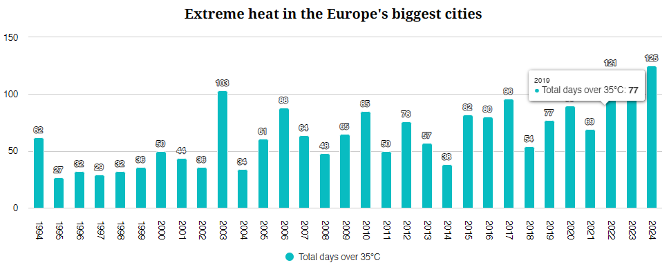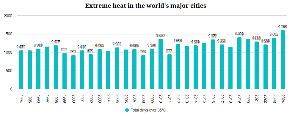 Mellan 1994 och 2003 var antalet dagar med en temperatur på över 35 grader i snitt 1 062 stycken per år i världens 43 folkrikaste huvudstäder. Under perioden 2015 och 2024 var motsvarande siffra 1 335.