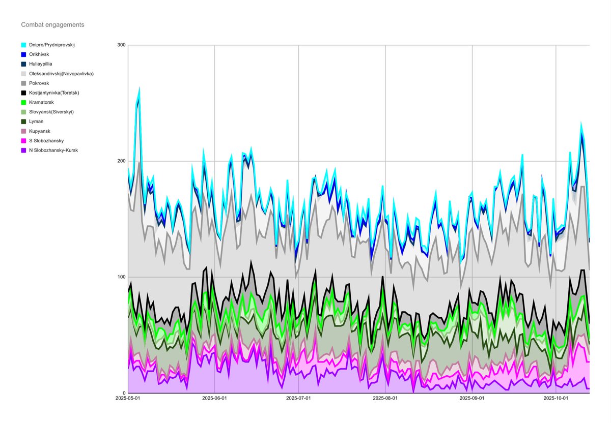 Kanske som du varit inne på att det handlar om fördröjning. Kan tänka mig att det är relativt enkelt att räkna strider/anfall och vara ajour med detta. Det rapporteras också tre gånger om dagen och siffrorna stiger linjärt över dagen fram till morgonrapporten. Motsvarande KWIA finns närmast i Pokrovsk där man i kvällsrapporten tar med just denna siffra (varför inga andra frontsektionerna rapporterar KWIA under loppet av dagen vet jag inte men det har väl med att Pokrovsk är den överlägset mest intensiva sektorn att göra.) Sen har vi natten. Förlustrapporten kommer ut mellan sex och sju (sv tid), så avrapportetingen från fronten måste ha skett minst någon timma innan, alltså senast vid femtiden. Då är det becksvart även på sommarhalvåret. Hur enkelt är det att räkna KWIA i mörker? Det är väl heller inget man använder mörkersikte till? Och kan man ens i dagsljus räkna ihop KWIA om dessa befinner sig bakom fronten? Nä, om det är någon siffra som laggar så är det nog KWIA, och det vore med tanke på de svårigheter jag föreställer mig finns när det kommer till att rapportera KWIA inte heller konstigt om det laggade.