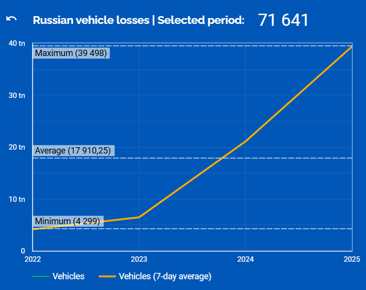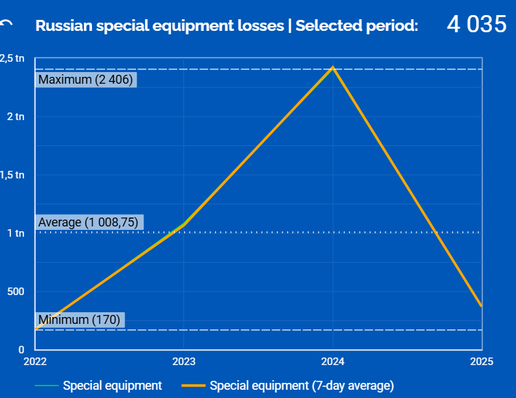 För 2025 ser vi förutom för artilleri enbart höga eller ökade förluster när det gäller ”billiga” resurser som manskap, drönare och enklare transportlösningar. Även artilleri skulle kanske kunna klassas som billigt om det är så att de får det mesta numera från Nordkorea.