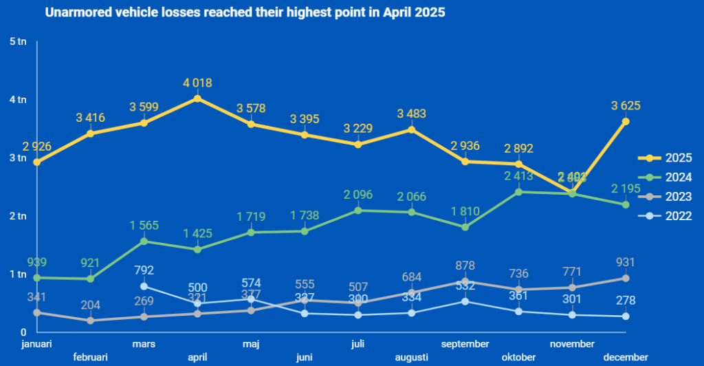 2025 var som helhet ett rekordår när det gäller mjuka fordon och artilleri men tittar vi i detalj på mjuka fordon ser vi inte någon ökning och när det gäller artilleri har förlusterna minskat över året men även antalet artilleriattacker.