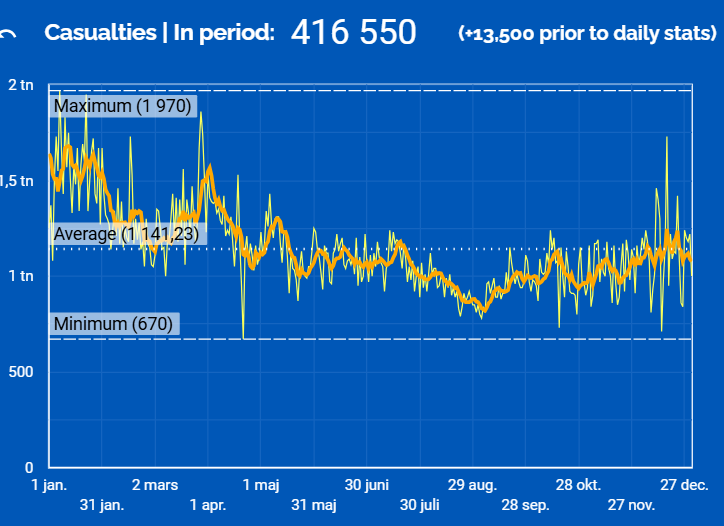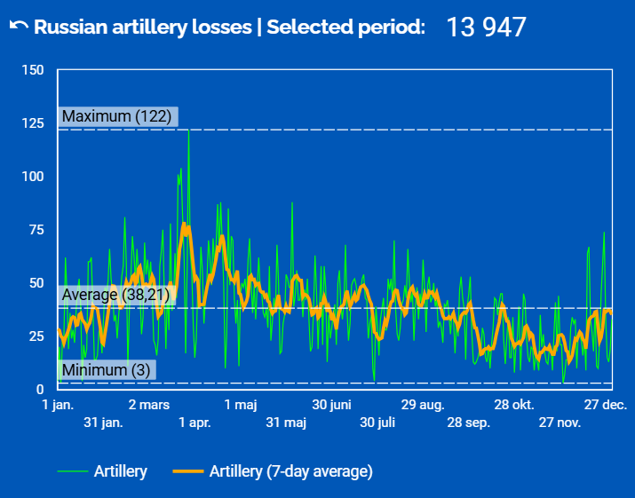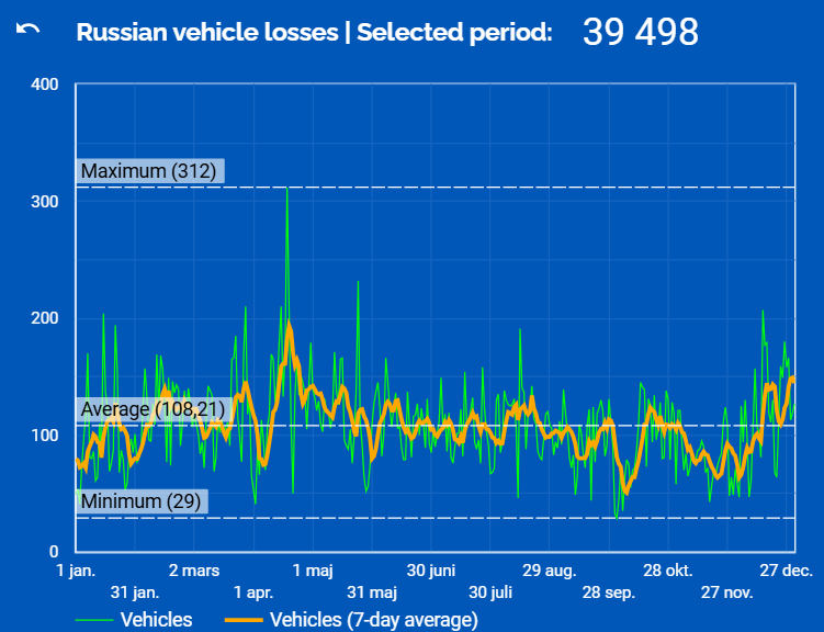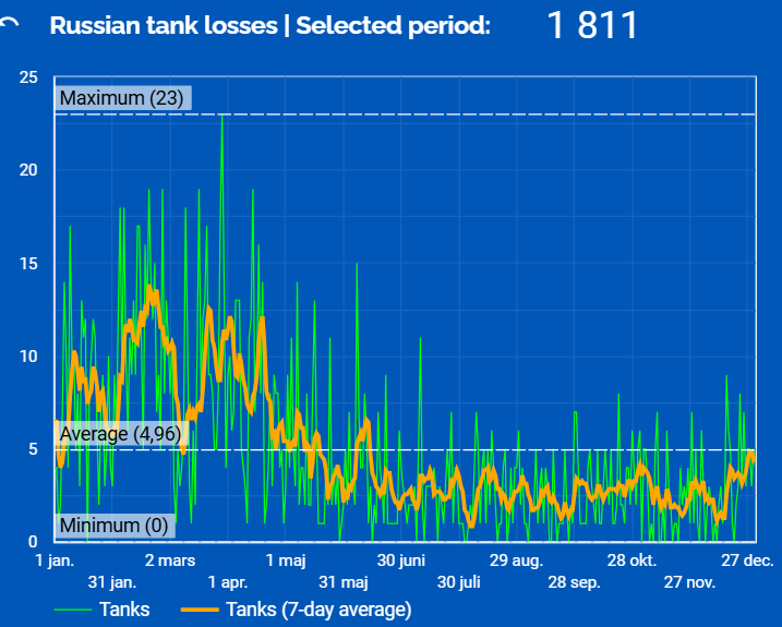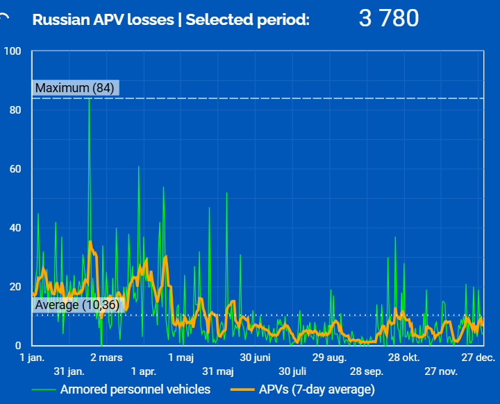 Ryssarnas förluster av stridsvagnar följer en liknande trend. Högre förluster (om än relativit låga sett till hela kriget) i början av året och från slutet av april gick det ner till under 5 per dag, Vi kan även här möjligen ana en liten ökning i slutet på året, men det kan lika gärna bara vara en normmal fluktiation.