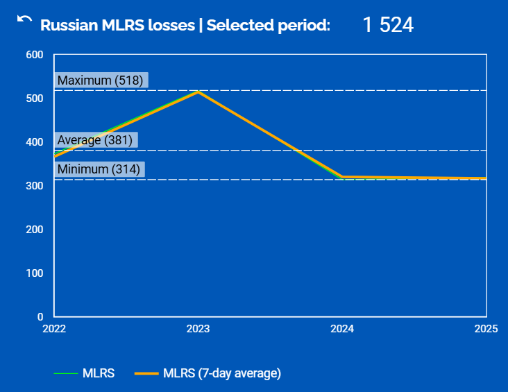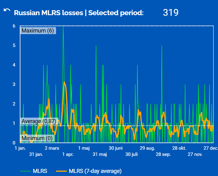 Här är 2025 det näst lägsta året med 319 st. 2024 var näst lägsta med 314 (grafen ger sken av att 2025 är lägre än 2024). 2023 är rekordåret med 518. Här kan man fundera på om Ryssland börjar få slut på pjäser, eller om de använder dem mer sparsamt eftersom har kortare räckvidd och är lättare att slå ut med drönare. MLRS har även dålig precision, en annan anledning till minskningen kan vara att FPV-drönare helt enkelt ersatt användandet.
