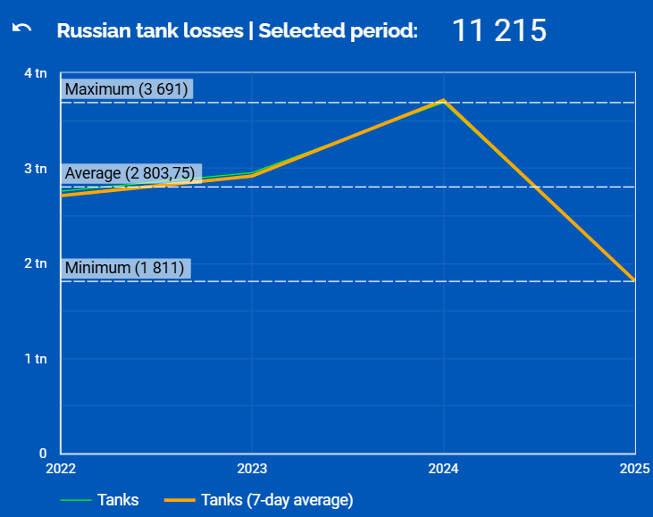 Precis som man anat under året har stridsvagnsförlusterna minskat och 2025 är hittills det åre med minst förluster med totalt 1 811 stridsvagnar. 2024 är så här långt reokordåret med 3691.
