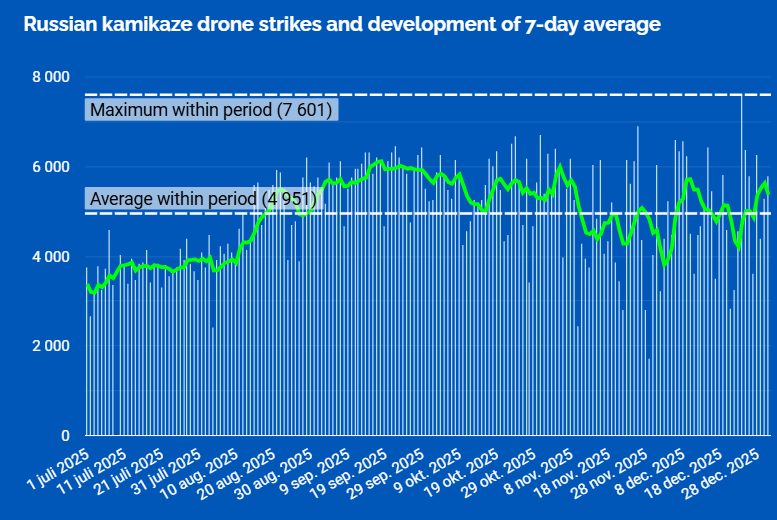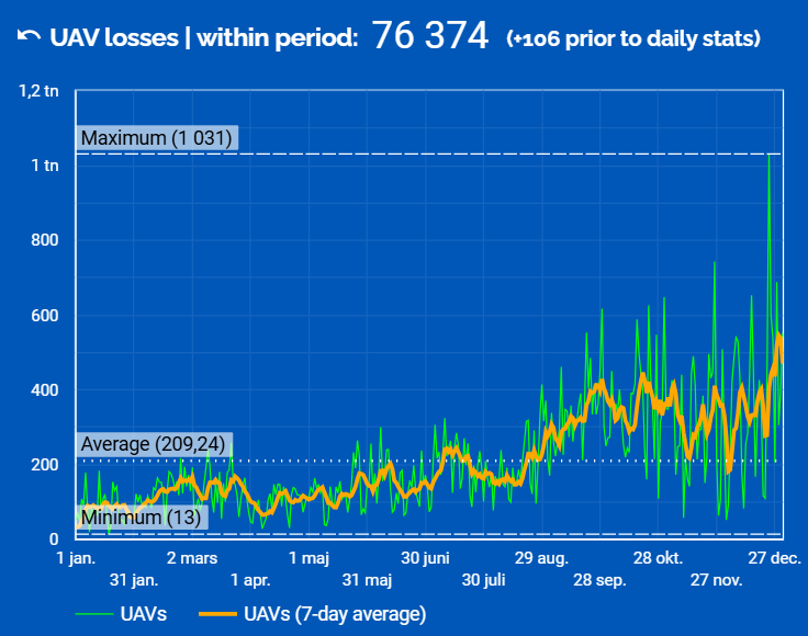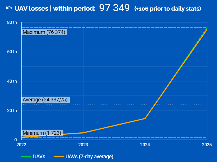 Ryssland har kraftigt ökat användningen av bl.a. Shaheds vilket även syns när det gäller förlusterna. 2025 slår rekordet med råge med 76 374 st, det är över fem gånger så många som 2024 då det var 14 456.