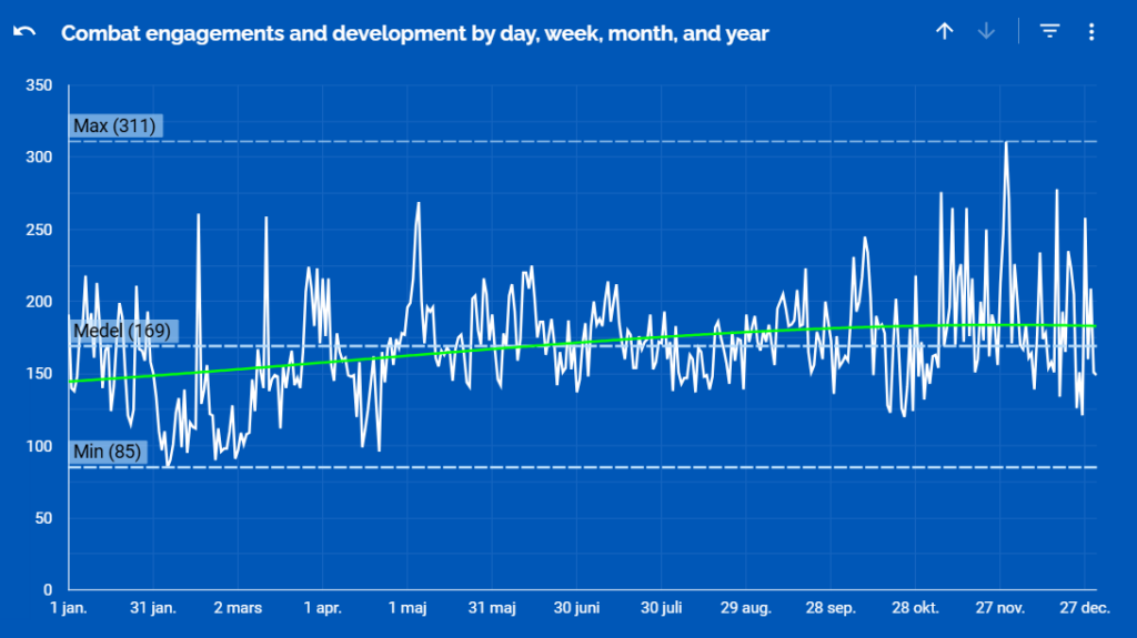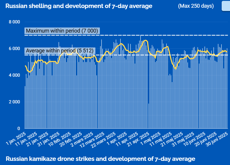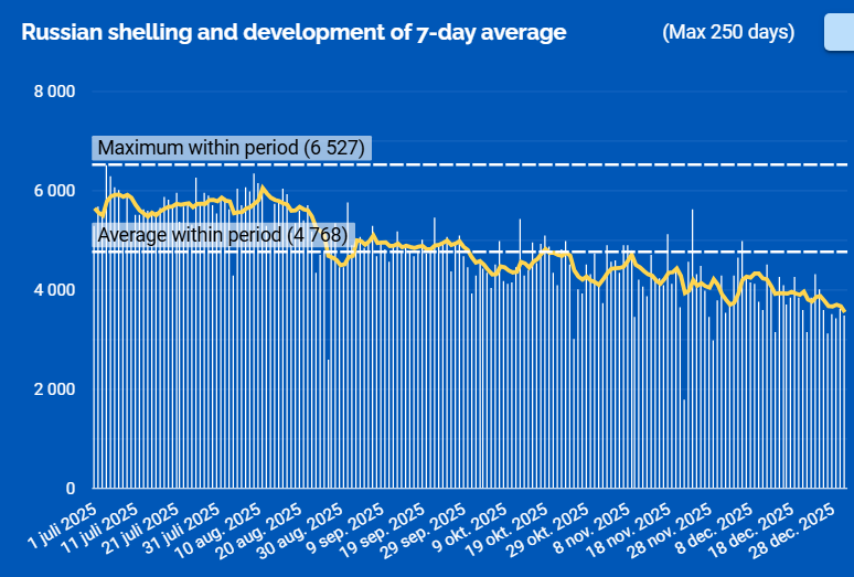 Även de här siffornar är intressanta att titta på och jämföra med förlusterna. Delvis följer det antal striderna ovan och även förlusterna där det här som intensivast i slutet på april. Vi ser en minskning i september, men sedan fortsätter trenden nedåt. 2025 var ett rekordår för artilleri men tittar vi i här i detalj på 2025 är trenden är tydlig att det nu stadigt minskar. Vi hade som högst ett snitt som låg runt 6200 i dag är vi nere på runt 3 500.