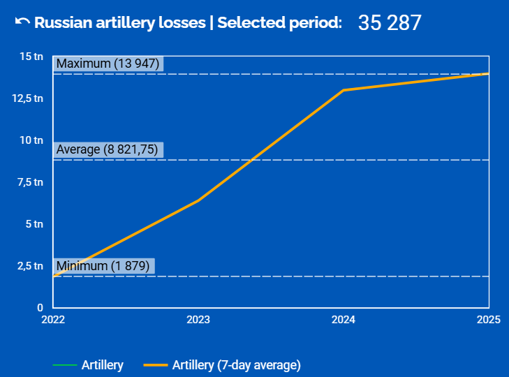 När det gäller artilleri blir i alla fall jag lite förvånad, då jag uppfattat det som att ryssarna använder allt mindre artilleri och att förlusterna även varit mindre. Trots det blir 2025 så här långt året med största antalet förluster med 13 947 tätt följt av 2024 med totalt 13 021. Nordkorea har försett Ryssland med artilleri och det kan nog vara en orsak till att de fortfarande har tillgång till många artilleripjäser. Jag har även sett uppgifter om att man gått ner i kaliber och att 152mm alltmer eratts av 122mm och ännu klenara. Dels är det billigare och dels ska visst 122mm vara vanligare i Nordkorea. Vi kan i alla fall konstatera att artilleriet ännu inte fasats ut i Rysslands krig mot Ukraina.