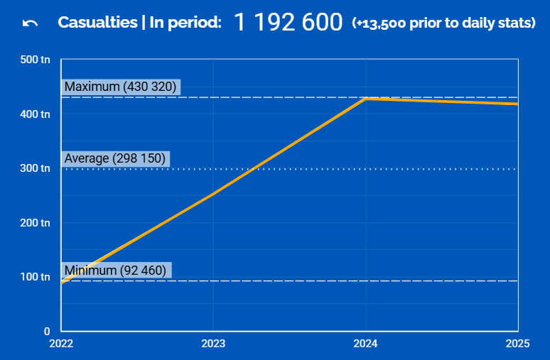 När det gäller förlusterna av dödad och skadad personal blev 2025 med 416 550 KWIA det näst högsta året, strax under 2024 med 430 320,