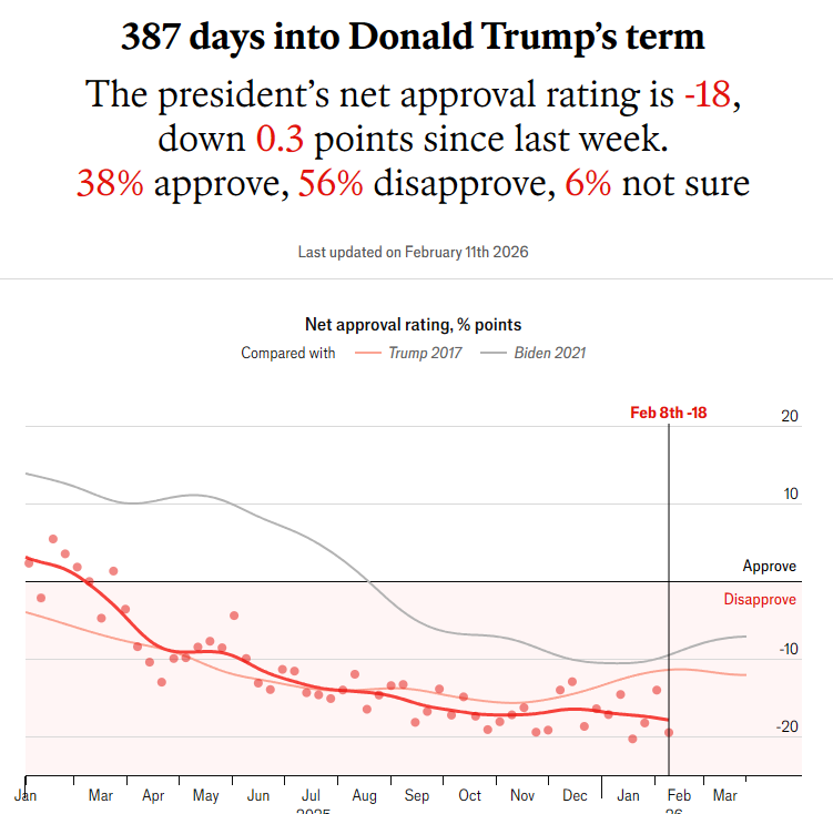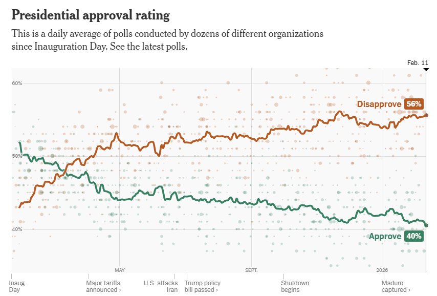 Enligt New York Times som viktar flera undersökningar är det inte riktigt lika ryckigt men Trump har just nu de sämsta värdena så här långt. Andelen approve har för första gången sjunkit till 40% samtidigt som disapprove ligger på 56% vilket den gjort under en kort period tidigare. Slår man i hop det blir det -16%.