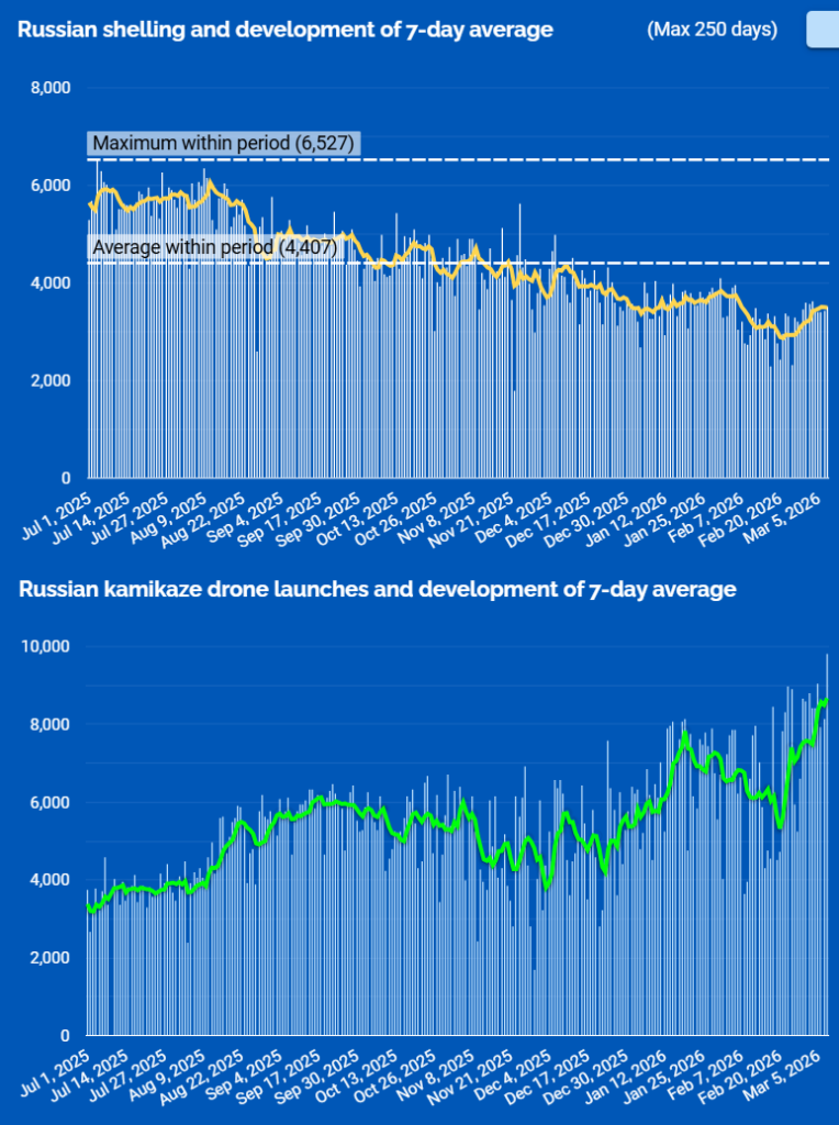 Här kan vi se att antalet artilleriattacker har minskat medan självmordsdrönarna istället öka kraftigt. Ett tecken på att modern krigföring har förändrats under kriget i Ukraina där billiga drönare med hög precision ersätter äldre dyrare och klumpigare lösningar. Artilleriet är långt i fårn utträknat men bara sedan 1 juni 2025 har det näst intill halverats medan FPV dörnarna istället har mer än fördubblats.