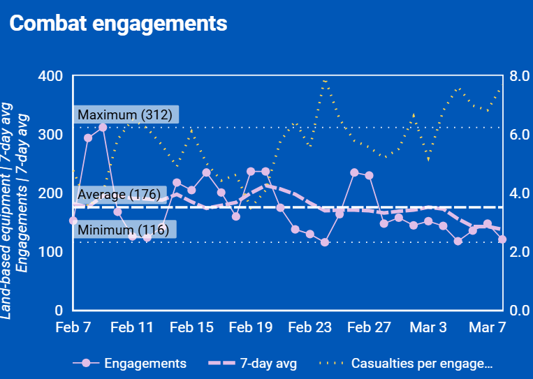 Här kan man se både antal strider och KWIA den senaste månaden. Tyvärr blir diagrammet oläsligt om man väljer ett längre intervall. När man ser det i detalj kan man konstatera att de inte riktigt hänger i hop. Enstaka sammandrabbningar påverkar allts inte KWIA på ett märkbart sätt. Det kan ev. beror på att rapporteringen inte alltid är i synk, men det kan också bero på att striderna sker med så få soldater att det inte märks i det stora hela.