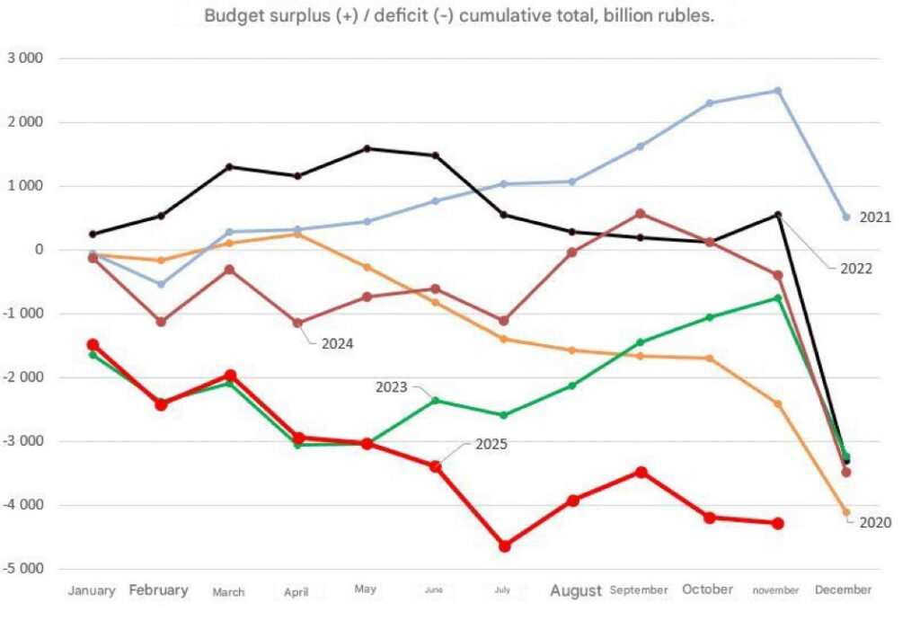 Ryska statens ekonomi mår inte direkt bra och i år är det värre än någonsin. Inte en enda månad med positivt resultat. 2023 började lika illa som 2025 men gick sedan lite bättre (väldigt märkligt hur lika de fem första månaderna var under de två åren, kan början av 2025 varit copy-paste från 2023?).