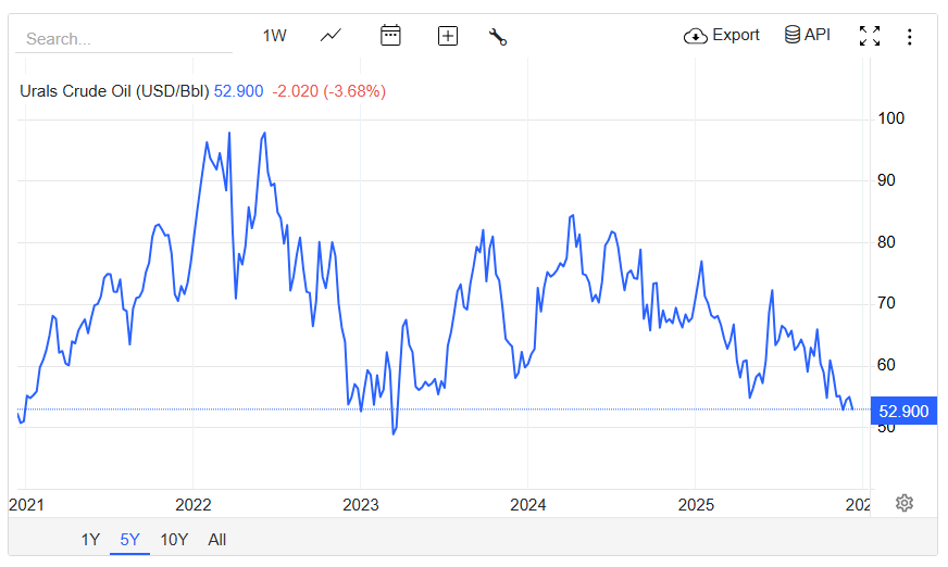 Den ryska ”Ural Oil” är nu nere på runt 53 (gårdagens siffror). Näst lägsta sedan kriget startade.