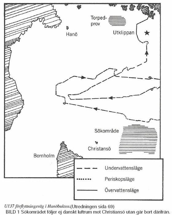 - U137 rörde sig i området NÖ om Bornholm innan den satte kurs mot Sverige1.