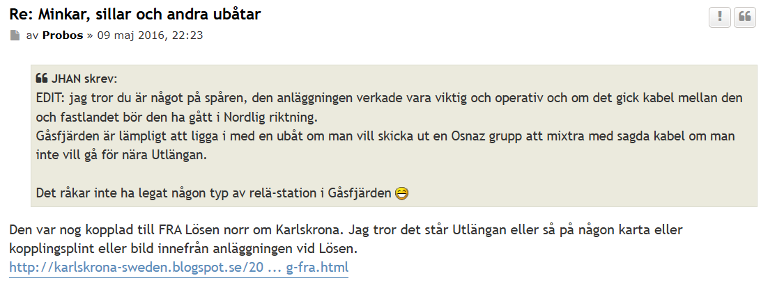 Vi vet att det fanns en FRA station på Utlängans och enligt en deltagare i Skalmantråden gick kabeln från stationen upp till FRA anläggningen i Lösen.