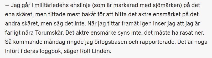 Faktum är att det finns ensmärken som marinen navigerade efter och veckan innan grundstötningen obseverade en officer som seglade i området att ett ensmärke rasat som gjorde att han nästan själv grundstötte på Torumskär.