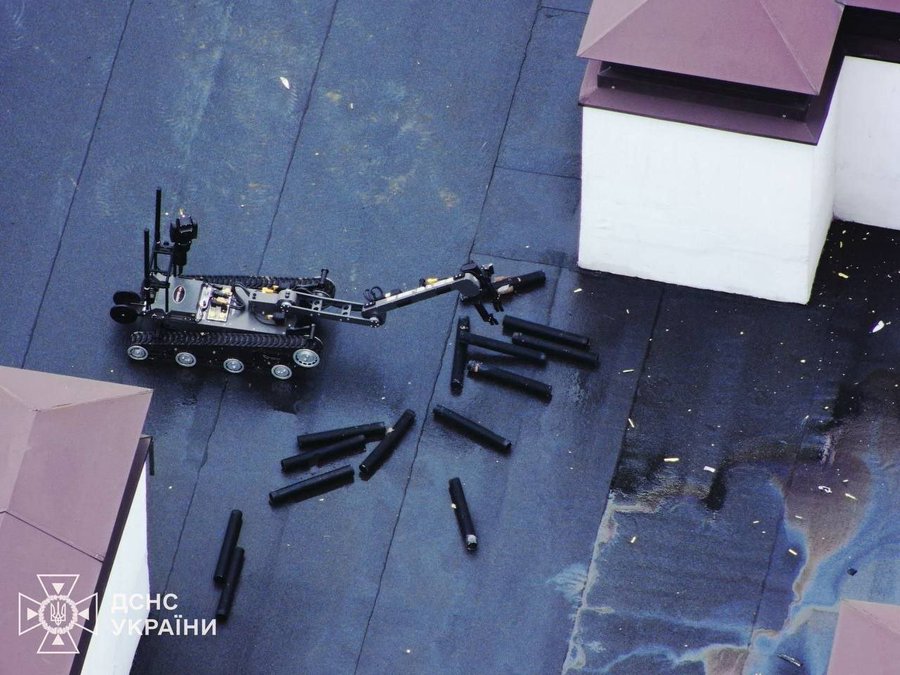 Robot samlar in klusterammunition från Shahed-drönare som hamnat på taket av ett höghus, och som har en tidsinställd självförstöringsmekanism och kan explodera när som helst.