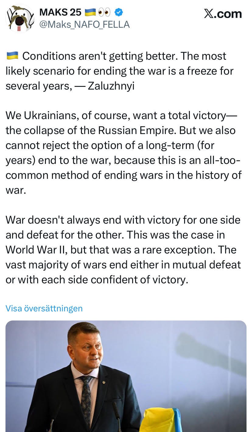 Före detta överbefälhavaren för Ukrainas militär, numera GB-ambassadör, men också av flera utomstående projicerad presidentkandidat, Valerie Zaluzhny, börjar prata om fördelar med långvarigt eldupphör.