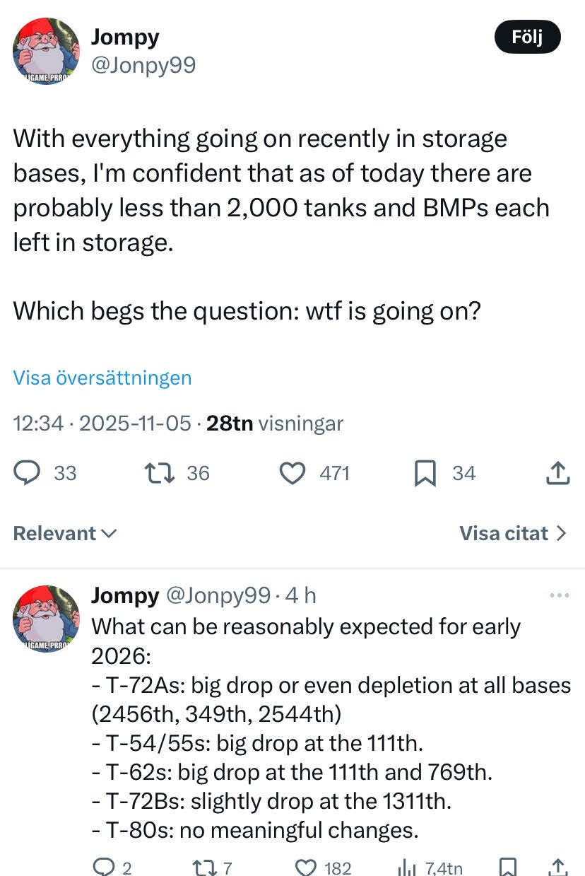 De som loggat materiel i depå har börjat ställa sig frågan vart alla stridsvagnar och BMP tagit vägen för dom brinner inte upp vid fronterna i Ukraina, och det dom börjat landa i är att RU har byggt upp förband med hårda fordon som inte är i Ukraina.
