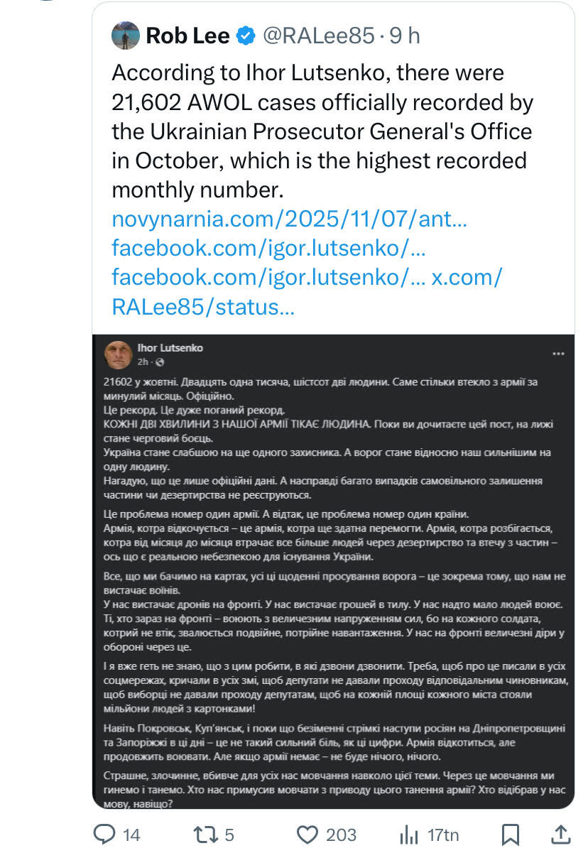 Jag vet inte om han tolkat det rätt men Rob Lee är en kredibel källa – han skriver +20 000st AWOL under en månad så som han formulerar sig, jag kan såklart inte läsa grundkällan i bilden under hans tweet.