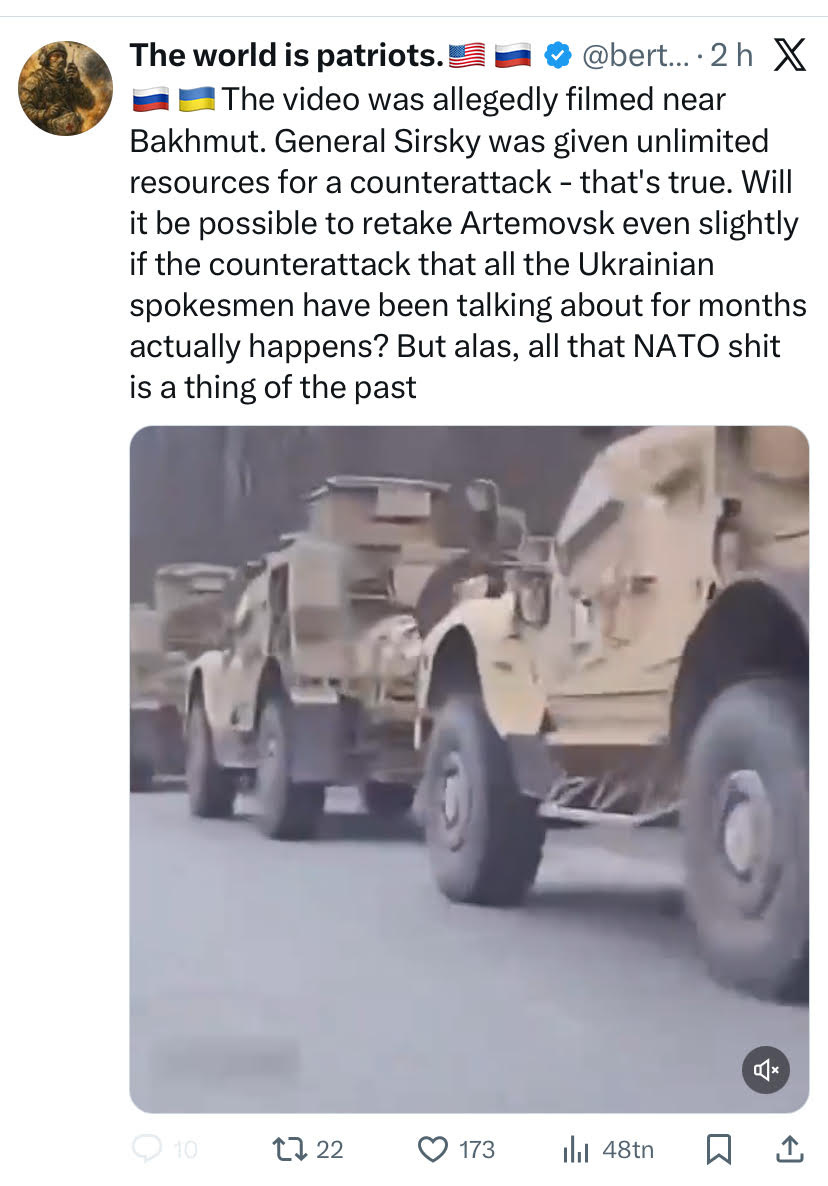 Förmodligen genomför Ukraina nu motanfall med del av sin offensiva strategiska reserv och förlustration är som tidigare 1:5 eller mer i offensiva operationer. Finns inga filmer som föreslår motsatsen och det ligger i linje med vad vi sett tidigare.