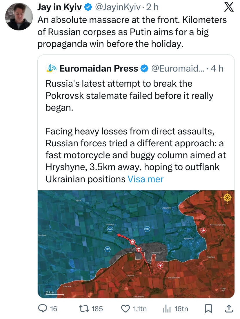 I Pokrovsk har RU satt in FSB enheter och Spetznaz som infiltrerande förband – dom har körts över totalt av Ukrainska motanfall som svept över området flertalet gånger nu, börjar bli en veckans höjdpunkt nästan.