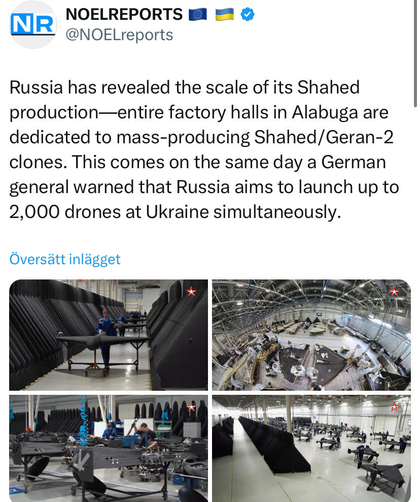 Ryssland använder 4000st FPV drönare per dygn (kolla in MXT statistik som kommentar här https://johanno1.se/sv/ukraina-daglig-uppdatering-21-juli-2025/) och dom vill försöka komma upp i ”2000st geran per natt” vilket dom inte kommer göra men säkert 500st med något dygns mellanrum.