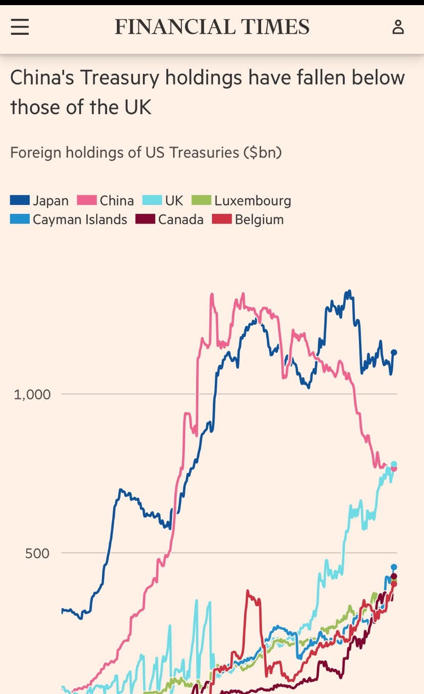 Sen har Kina antingen slutat köpa USA statsskuld eller säljer – kan inte avgöra denna svarta magi som kallas ekonomi men det har ju tidigare sagts att det är skäl för USA att gå i krig för och det har dom gjort tidigare för mindre, Libyen till exempel.