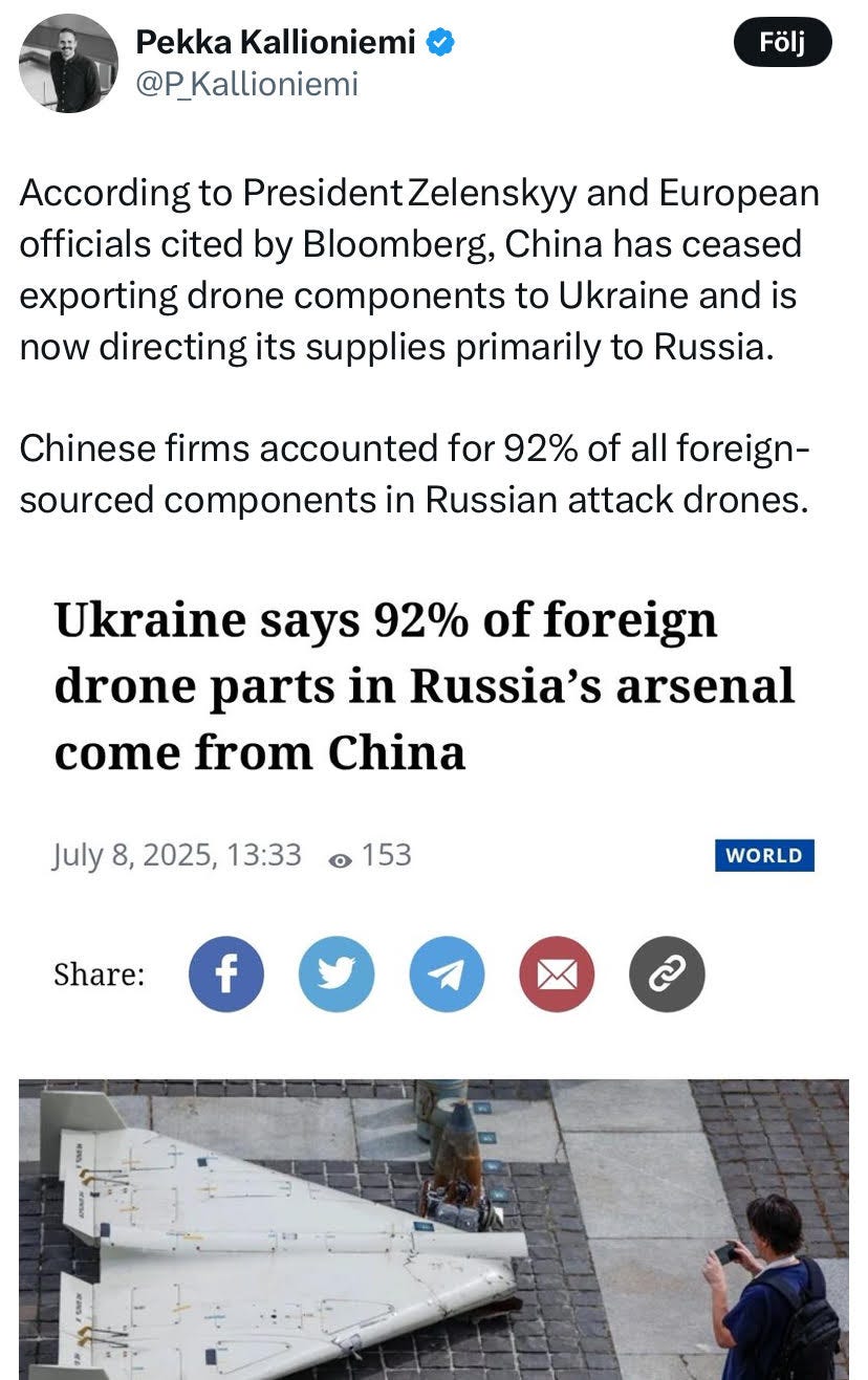 Samt att Kina nu tillhandahåller 92% av komponenterna till ryska drönare fick vi veta häromveckan, länk på min Bluesky.