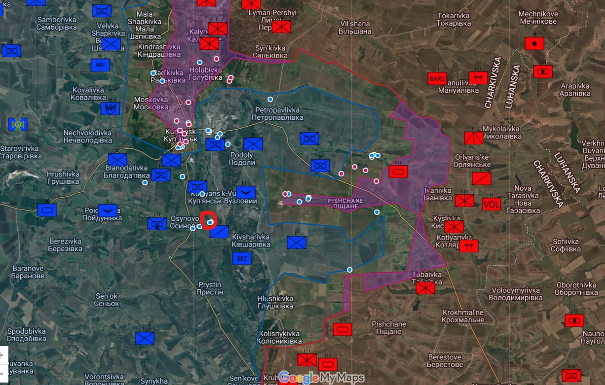 Jag hade fel angående Kupiansk, det finns två övergångar över Oskil kvar, lite slarvigt av mig, men den anfallsvektor som gått västerut är riktad just mot dessa två.